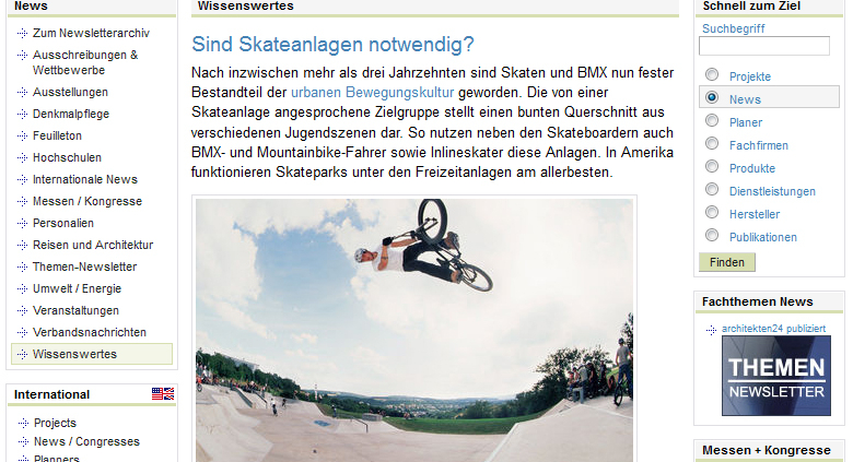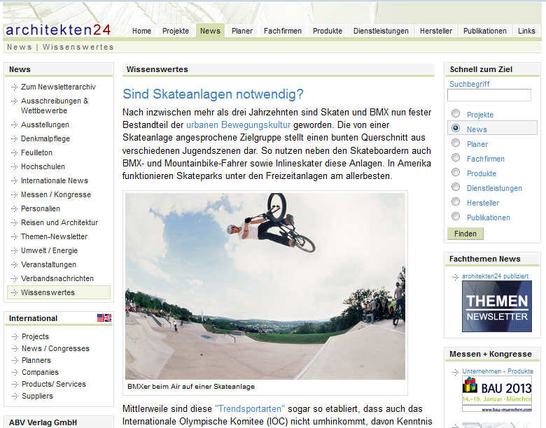 Für das Onlinemagazin ‚architekten24.de‚ hat Ralf Maier einen Beitrag mit dem Titel ‚Sind Skateanlagen notwendig?‚ verfasst.