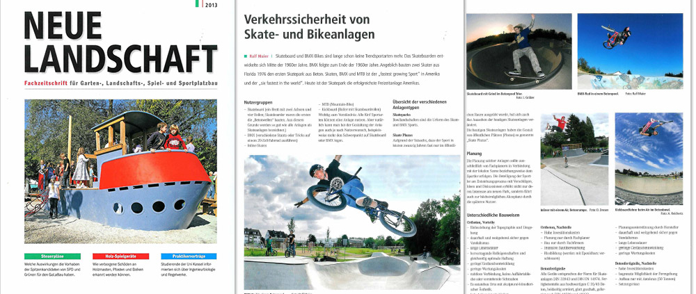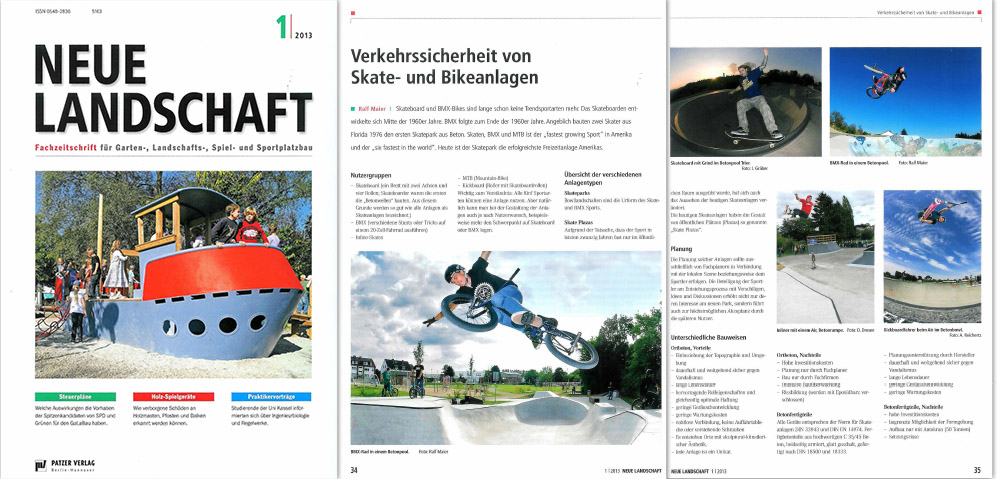 In der Ausgabe 1/2013 des Magazin „Neue Landschaft“ gibt es einen ausführlichen fünfseitigen Bericht von uns über die „Verkehrsicherheit von Skate-und Bikeanlagen„.
