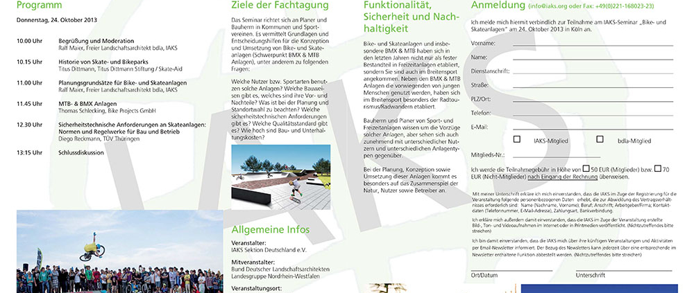Das von uns und der IAKS Sektion Deutschland e.V. und dem Bund Deutscher Landschaftsarchitekten (Landesgruppe Nordrhein-Westfalen) erarbeitete Seminar “Bike- und Skateanlagen” auf der FSB-2013 in Köln war ein voller Erfolg.