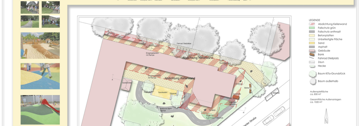 Die bestehende Außenanlagen der Kita werden im Rahmen der Gebäudesanierung überabeitet und um weitere Spielangebote ergänzt.