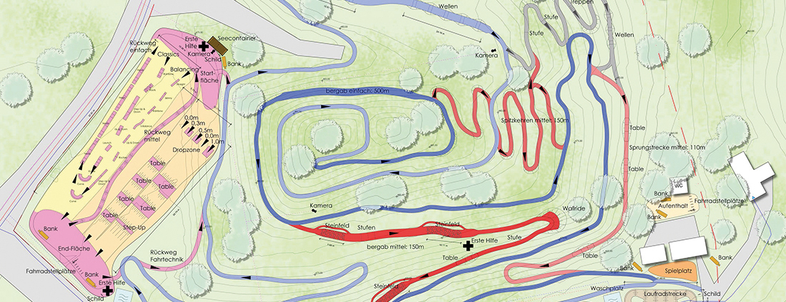 Der neu geplante Bike-Parcours befindet sich in Hanglage Richtung Süden und Osten. Im flacheren Westteil liegt ein Übungsbereich für Fahrtechnik und im Süden, am Eingang der Anlage in unmittelbarer Umgebung zur Bärenlochhütte, sind ein Pumptrack, Laufradtrack, Spielplatz, Aufenthaltsbereich und sanitäre Anlagen vorgesehen. Alle Bereiche sind durch befestigte Zuwege erreichbar und fügen sich in die bestehende Struktur ein.