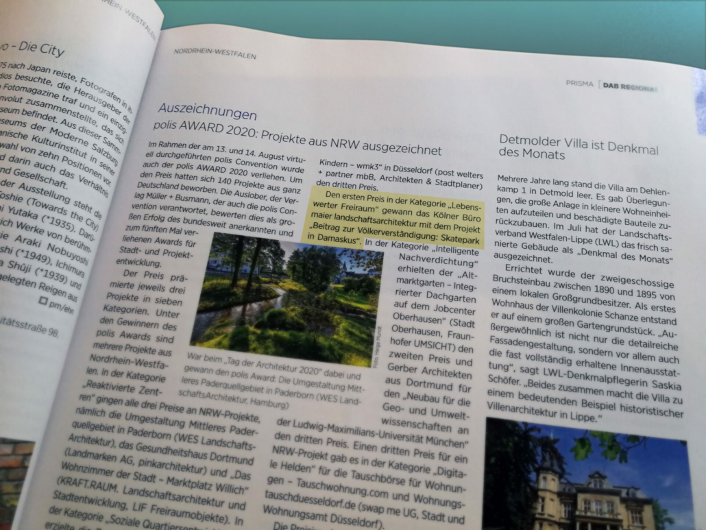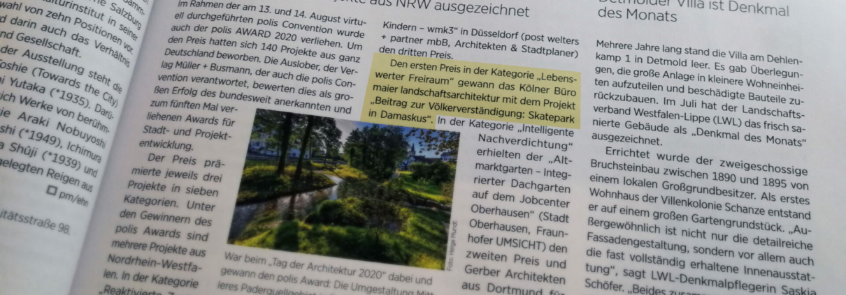 In der September Ausgabe des Deutschen Architekten Blatt werden wir als Gewinner in der Kategorie „Lebenswerter Freiraum“ des polis Award 2020 erwähnt.