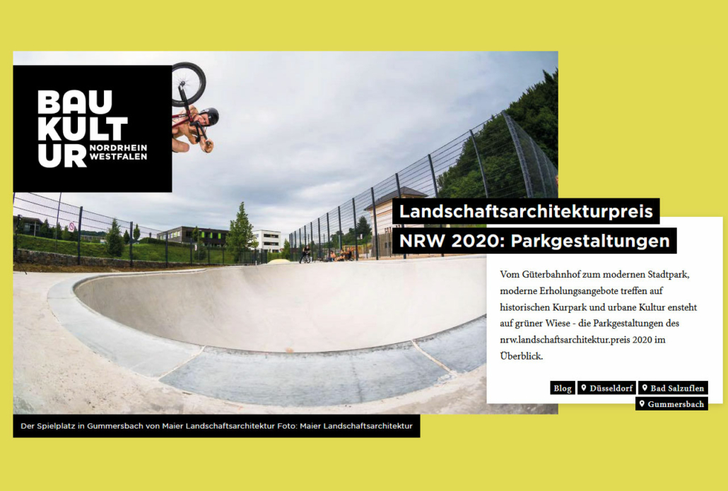Baukultur Nordrhein Westfalen hat im Rahmen des Landschaftsarchitekturpreis NRW 2020 unseren Spiel- und Sportpark in Gummersbach auf seiner Website vorgestellt.