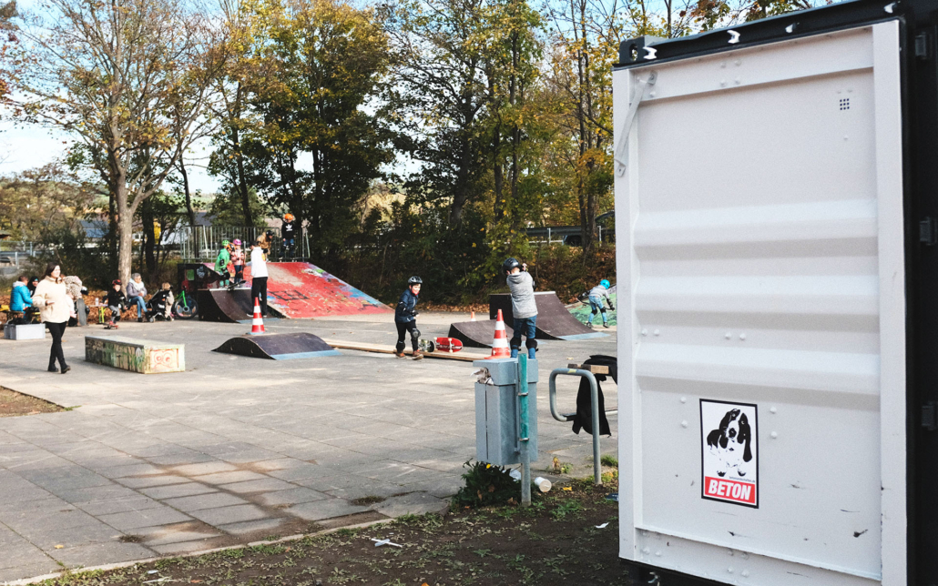 Ab sofort können sich hier bis zu 30 Kids, zwei Mal in der Woche, Skateboards sowie Schutzausrüstung ausleihen und in pädagogisch begleiteten Workshops das Skaten lernen. Am 6. November fand hier der erste Workshop mit Coaches gestellt von skate-aid, lokalen Skatern und Mitarbeitern von Betonlandschaften statt.