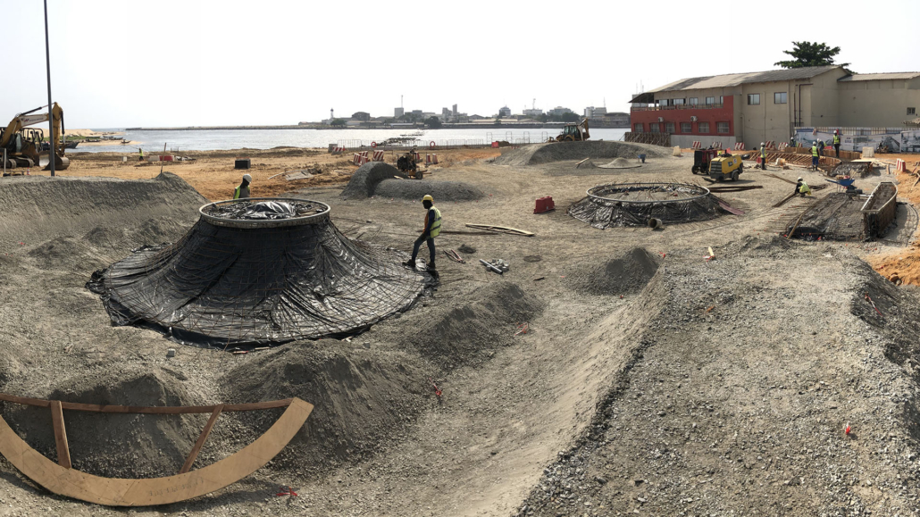 Der Bau des neuen Skateparks in Cotonou, Benin, geht gut voran. Ein großer Teil der Schalungs- und Bewehrungsarbeiten sowie Sauberkeitsschichten sind bereits fertiggestellt.