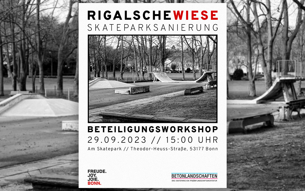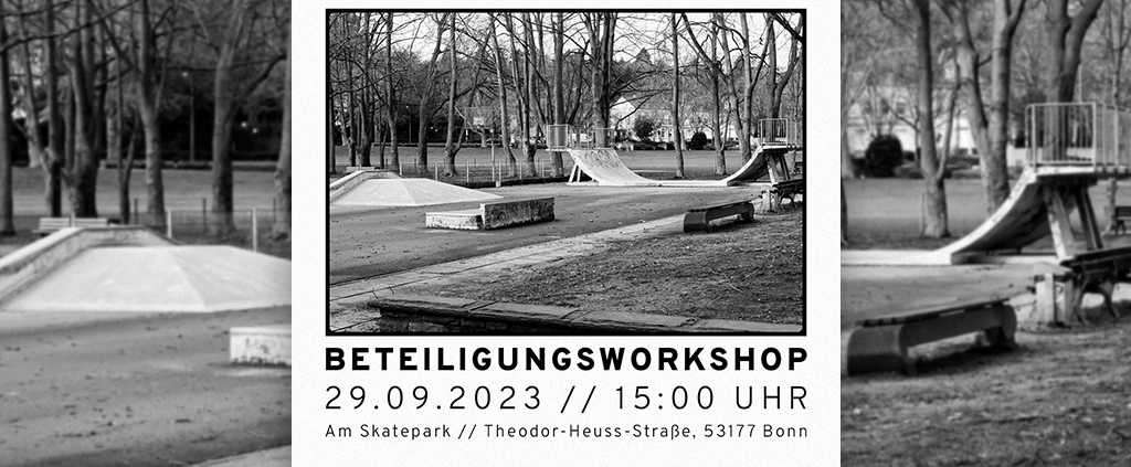 [:de]Am 29.9. findest der erste Beteiligungsworkshop für die Skateparksanierung in Bonn Bad Godesberg statt. Dieser findet an der Rigalschen Wiese im alten Skatepark statt.[:en]On 29.9. the first participation workshop for the skatepark renovation in Bonn Bad Godesberg will take place. This will take place at the Rigalsche Wiese in the old skatepark.[:]