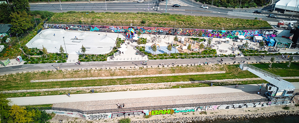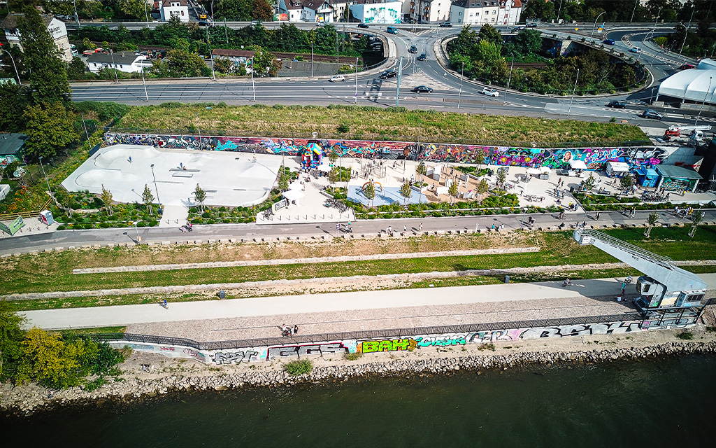 With the expansion of the Rhine embankment by a modern recreational facility, the offer for sports enthusiasts and the free cultural scene could be expanded. Especially non-club sports like skating, BMX riding, bouldering, parkour and calisthenics find a place in the newly designed facility. At this location, there is no trace of Wiesbaden’s image as a boring spa town.