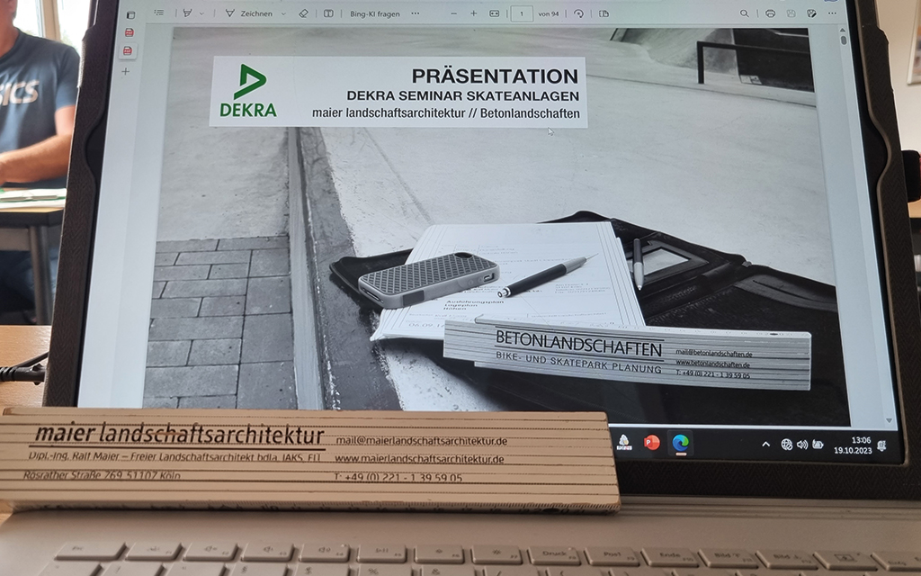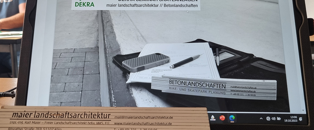 Landschaftsarchitekt Ralf Maier aus Köln behandelte im Theoretischen Teile die Anwendung der Skatepark Norm DIN EN 14974 sowie der FLL-Empfehlungen für Planung, Bau und Instandhaltung von Skate- und Bikeanlagen.