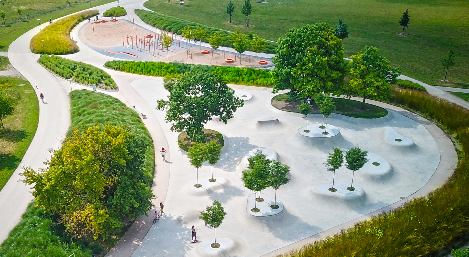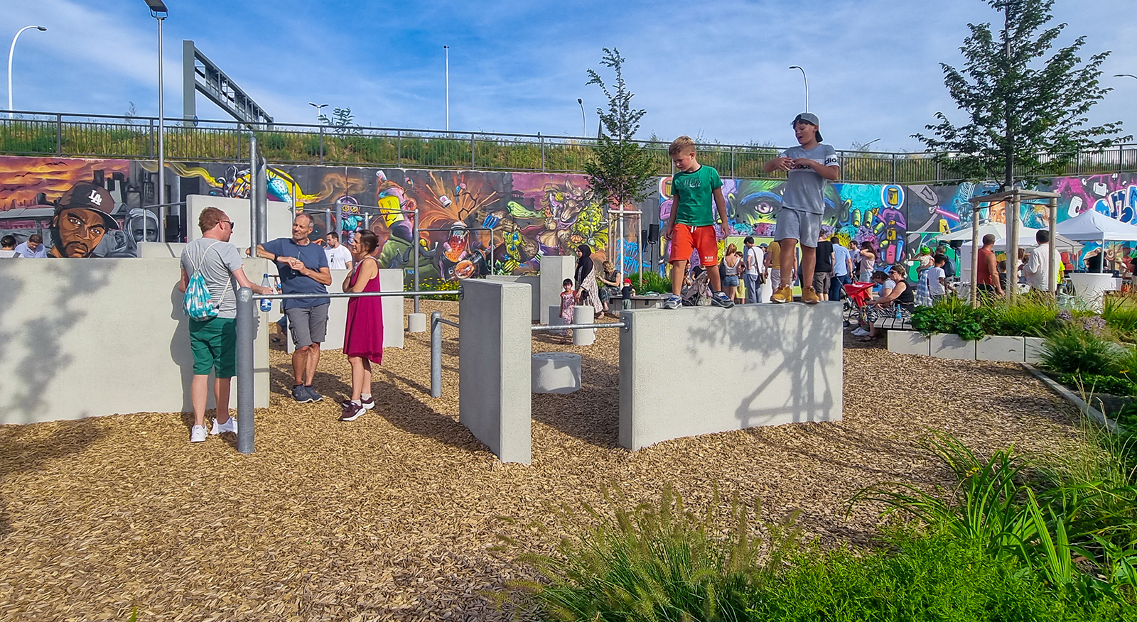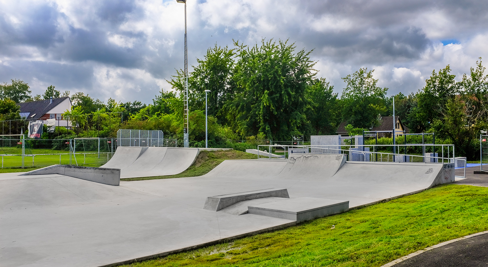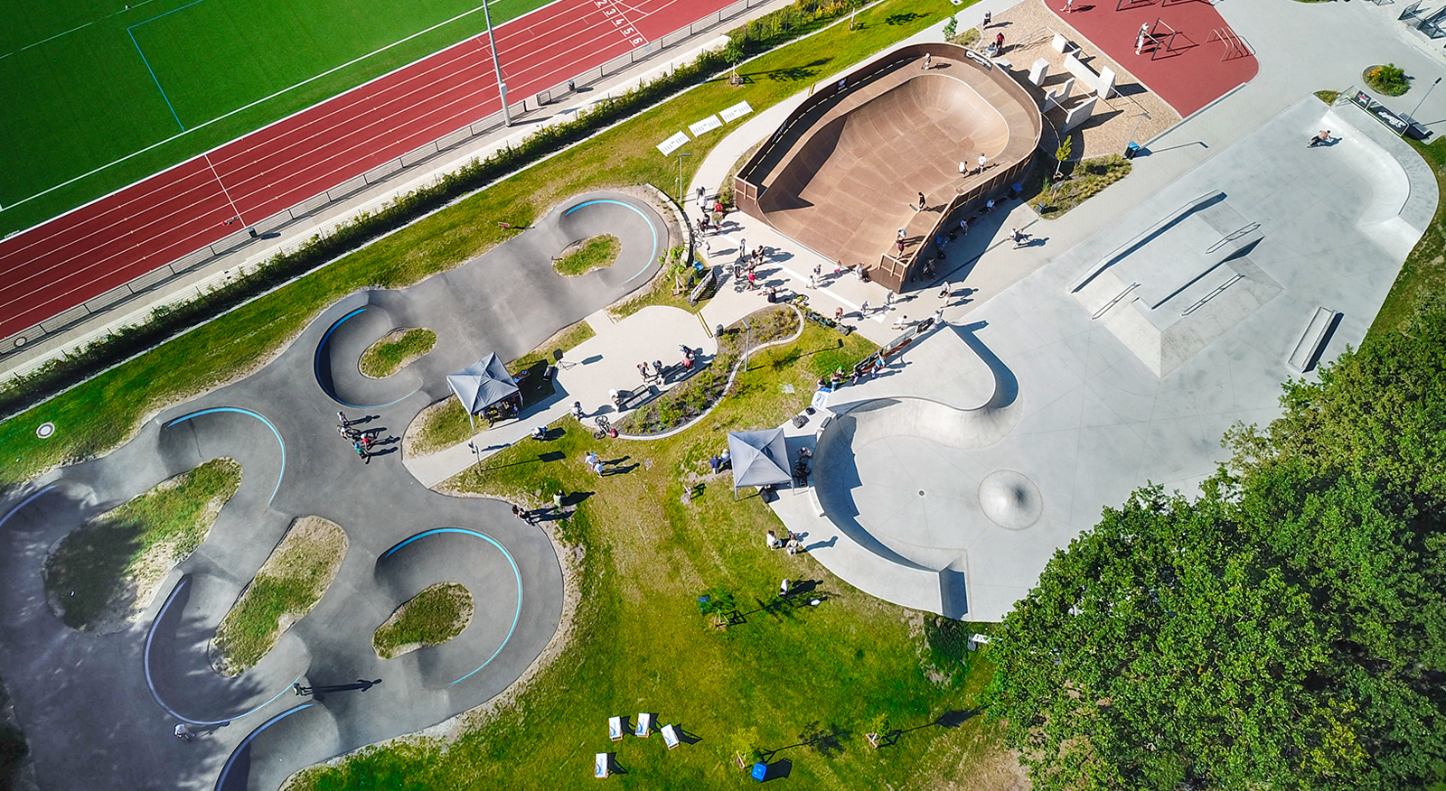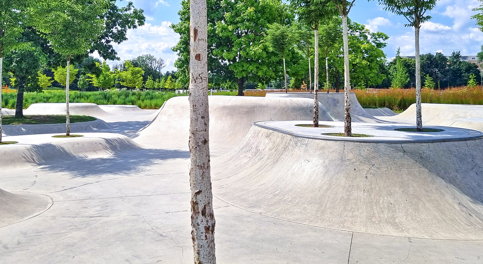 Der 800 m² große Skatepark in Ortbetonbauweise wurde nach Nutzer-Workshops optimal für Skateboarding, BMX, Scooter, Inlineskating und WCMX gestaltet. Ergänzt wird er durch eine 250 m² große Calisthenics-Zone mit griffigen Stangensystemen, eine 180 m² Parkouranlage sowie eine 9 Meter lange Boulderwand. Die Sportbereiche sind durch begrünte Aufenthaltsflächen verbunden und bieten dank Beleuchtung ganzjährige Nutzungsmöglichkeiten.