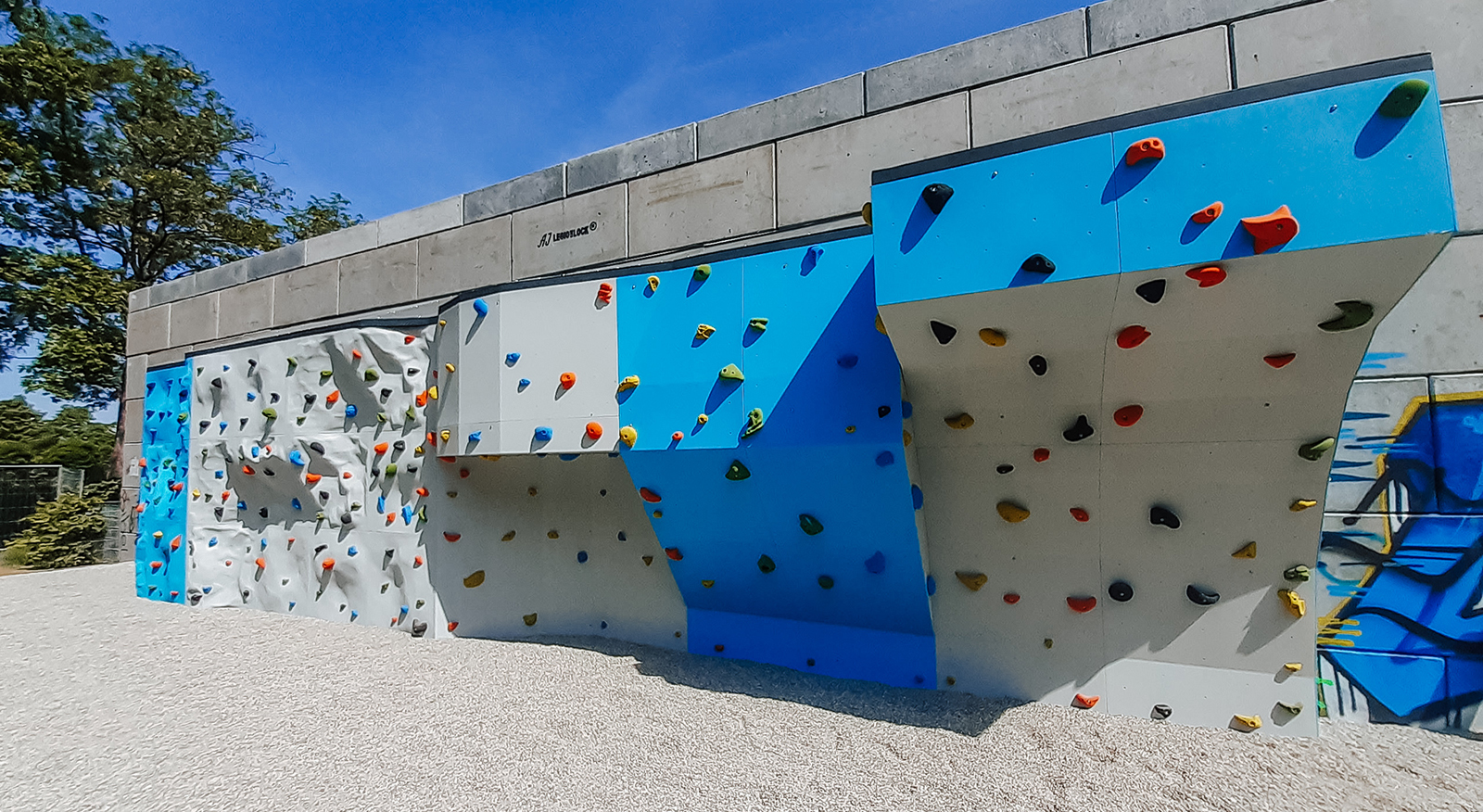 Im Darmstädter Bürgerpark wurde die bestehende Lärmschutzwand des Bikeparks intelligent erweitert: Eine hochwertige Boulderwand schafft auf zwölf Metern Länge und drei Metern Höhe neue sportliche Möglichkeiten. Die innovative Integration in die bestehende Infrastruktur verbindet Funktionalität mit sportlichem Mehrwert.