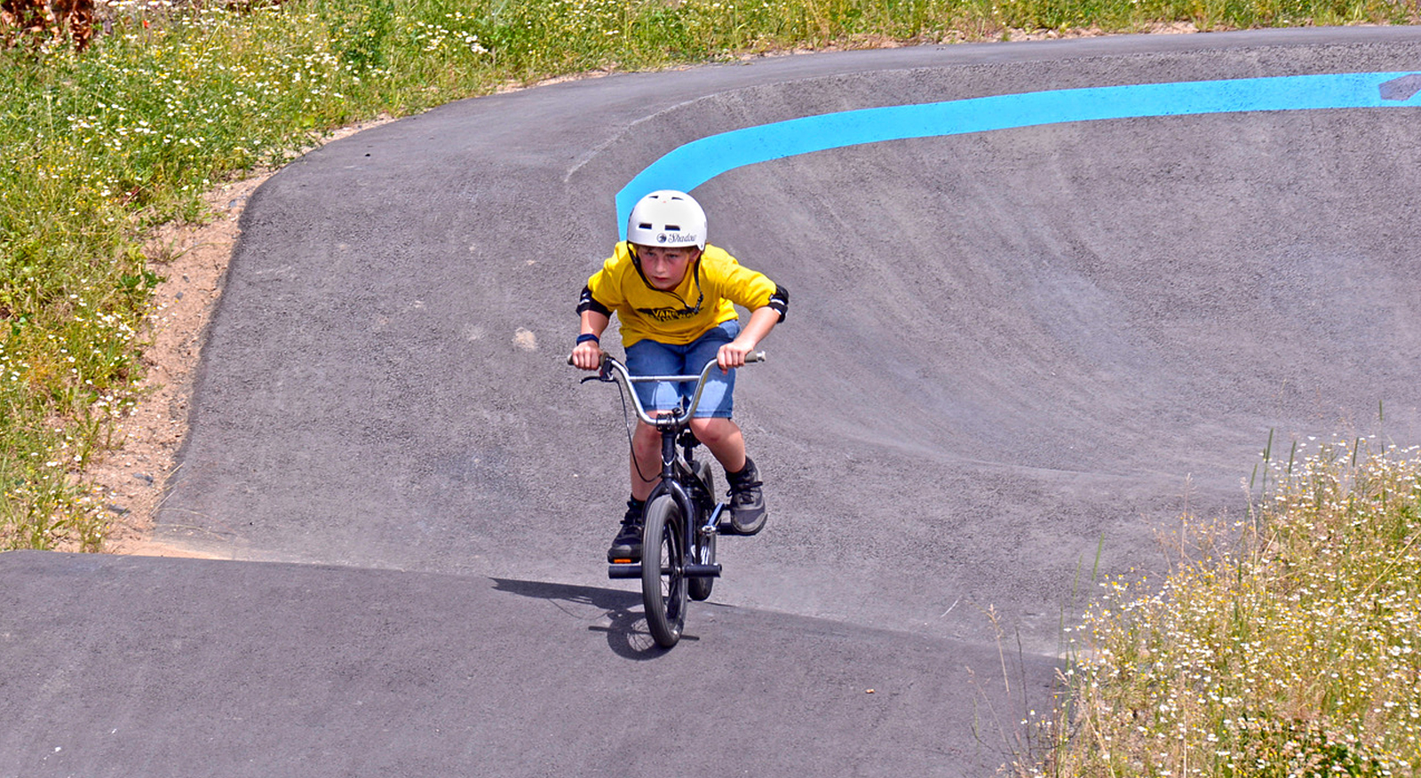 Im Rahmen einer EU-Fördermaßnahme wurde in Rheinberg ein ehemaliger Bolzplatz zur vielseitigen Sport- und Bewegungsanlage transformiert. Das 3.500m² große Areal vereint einen abwechslungsreichen Pumptrack, einen Kidstrack und einem naturgetreu gestalteten Kletterfelsen.