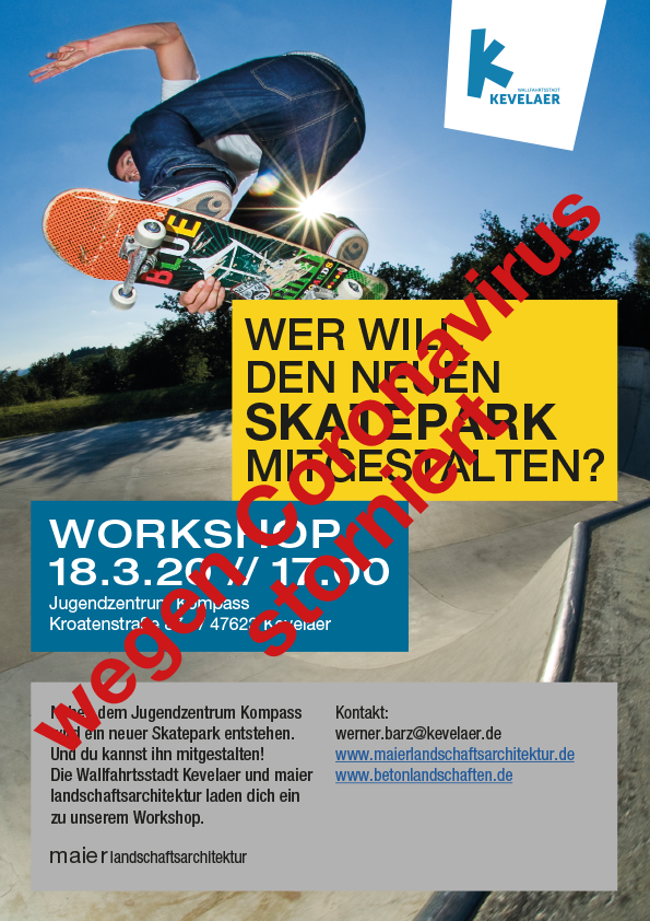 Wir haben uns schon sehr auf unseren Workshop gefreut, der am 18.3. stattfinden sollte, um mit euch den neuen Skatepark zu planen. Leider muss darauf in diesen Tagen, in Hinblick auf die Verbreitung des Corona Virus, verzichtet werden. Eure Ideen sind aber dennoch willkommen und können an Herrn Barz von der Stadt Kevelaer geschickt werden: werner.barz@kevelaer.de